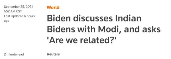 据报道,在两人首次白宫会晤开始时,拜登称,他在1972年首次当选议员时了解到拜登家族的印度分支,并收到了住在孟买的一个名叫“拜登”的人的一封信。